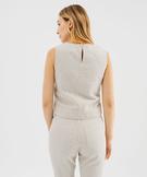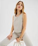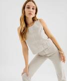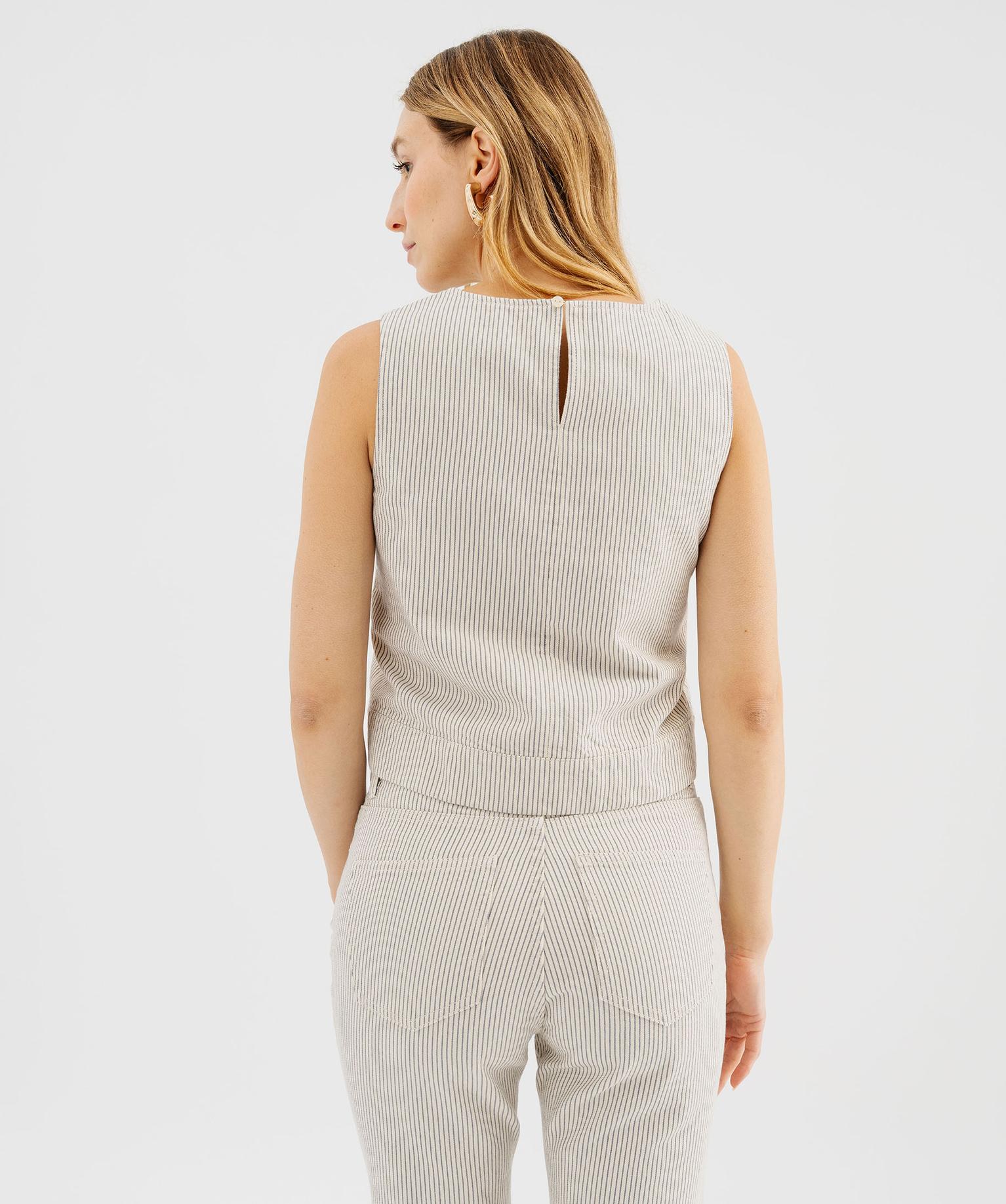 Offrez-vous une allure ultra tendance avec cette blouse sans manches en toile denim ! Un modèle original, orné de fines rayures arborant une allure vintage. Cette blouse femme affiche une coupe droite, courte et un joli décolleté arrondi. Des pinces poitrine assurent à ce top un tombé impeccable, tandis qu’un large biais souligne la base avec élégance. Il se ferme par un bouton dans le haut du dos, avec ouverture goutte. Un top rayé à porter avec le jean assorti pour un ensemble coordonné ou avec un jean classique.
