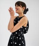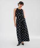 Cette blouse sans manches revisite un l'iconique motif pois avec audace. Un motif graphique et élégant imprimé sur un crêpe de viscose à la fluidité exemplaire. Sa coupe aérienne se distingue par des épaules ultra dégagées, offrant une allure estivale et une liberté de mouvement absolue. L’encolure ronde, délicatement froncée, apporte un beau volume vaporeux qui flatte toutes les silhouettes. Cette blouse femme mise sur des détails raffinés : une fente élégante au dos sécurisée par deux liens à nouer, une perle à l'extrémité de chaque lien. Un basique chic au caractère rétro affirmé, à porter avec un pantalon flare à taille haute.