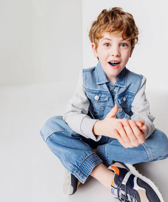 Gémo réinvente le blouson en jean et y ajoutant des manches de sweat ! Ce blouson garçon affiche un look atypique qui permettra de dynamiser le vestiaire des enfants. Il emprunte les codes de la veste en jean traditionnelle : nombreuses surpiqûres, poches à rabat sur la poitrine et gros boutons métalliques. Les manches sont molletonnées et resserrées au poignet par un bord-côte. Un mix des genres original qui remportera tous les suffrages. Deux poches poitrine et deux poches raglan.
