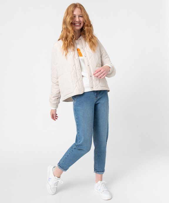 Un blouson matelassé très élégant, qui accompagnera de nombreuses tenues. Confectionné dans une matière finement matelassée, ce blouson pour femme reste très élégant. Il affiche une coupe droite non resserrée dans le bas et se ferme par une rangée de boutons pression. Il possède un col et des poignets en bord-côte qui lui apportent une touche décontractée et deux poches surpiquées sur l’avant. Un blouson parfait pour l’intersaison ou à glisser sous un manteau en laine en plein hiver.