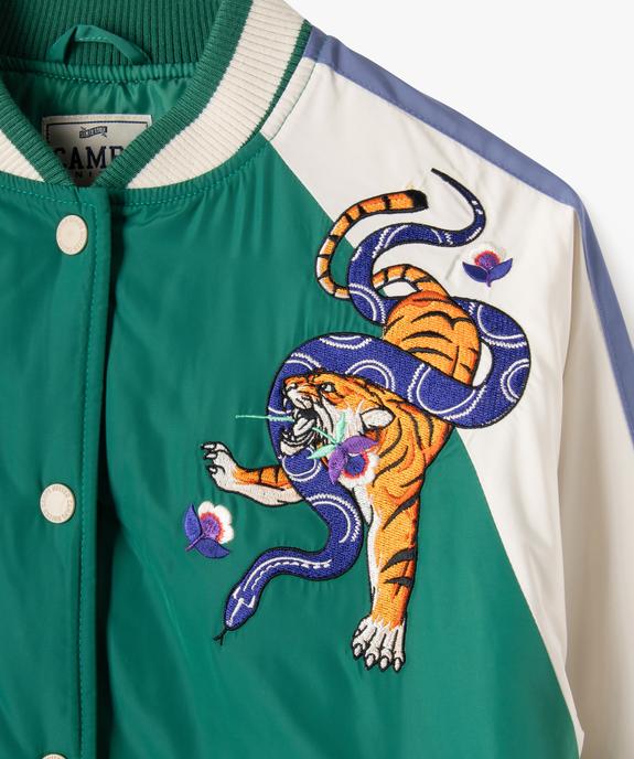 Ce blouson matelassé ajoutera une note vintage dans le vestiaire des filles. Inspiré des campus américains, ce blouson Camps United s’affiche dans un mix de couleurs vives, avec des finitions en bord-côte bicolores. Il arbore de jolies broderies sur le buste, l’une représentant une lutte entre un tigre et un serpent, l’autre le logo de la marque. Un blouson fille chaud et confortable dont le rembourrage est confectionné en polyester recyclé. Il se ferme à l’aide de boutons pression et possède deux poches raglan. Emmanchures raglan.