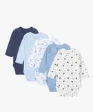 Un lot de 5 bodies à manches longues et fermeture croisée à glisser dans la garde-robe de bébé. Confectionnés en coton, ces bodies bébé garçon assurent beaucoup de confort sous les vêtements. Ils sont fermés sur le côté droit et à l’entrejambe par boutons pression. Un lot de sous-vêtements bébé composé de 3 bodies unis et de 2 bodies imprimés.
