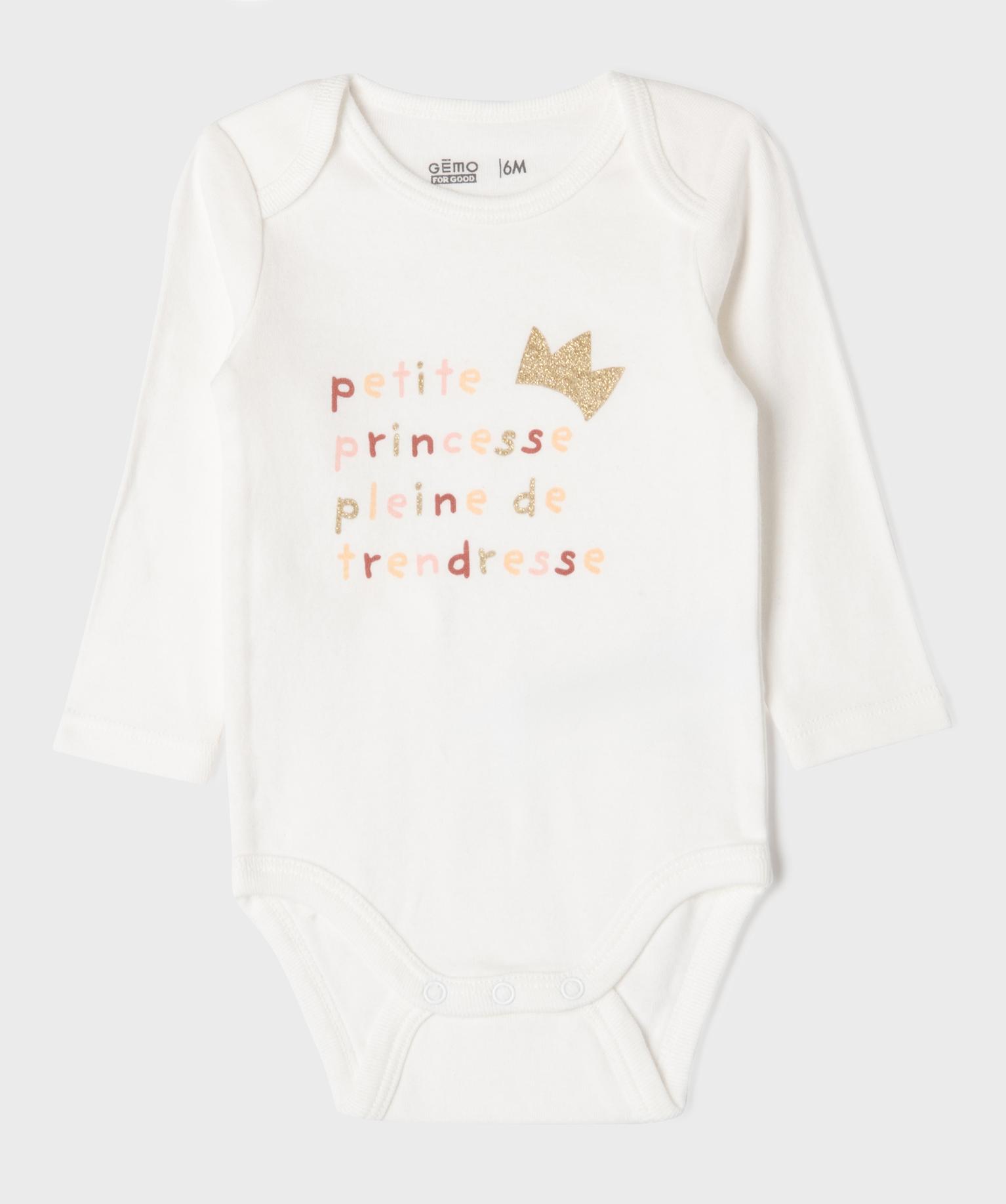 Ces 3 bodies à manches longues accompagneront les petites princesses sous tous leurs vêtements. Des bodies en coton biologique qui respectent les peaux fragiles, dotés d’une encolure américaine facilitant l’habillage. Ce lot de bodies bébé fille se compose d’un body uni, d’un modèle à motifs fleuris et d’un modèle avec inscription pailletée sur le buste. Les boutons pression à l’entrejambe permettent de changer la couche de bébé facilement.