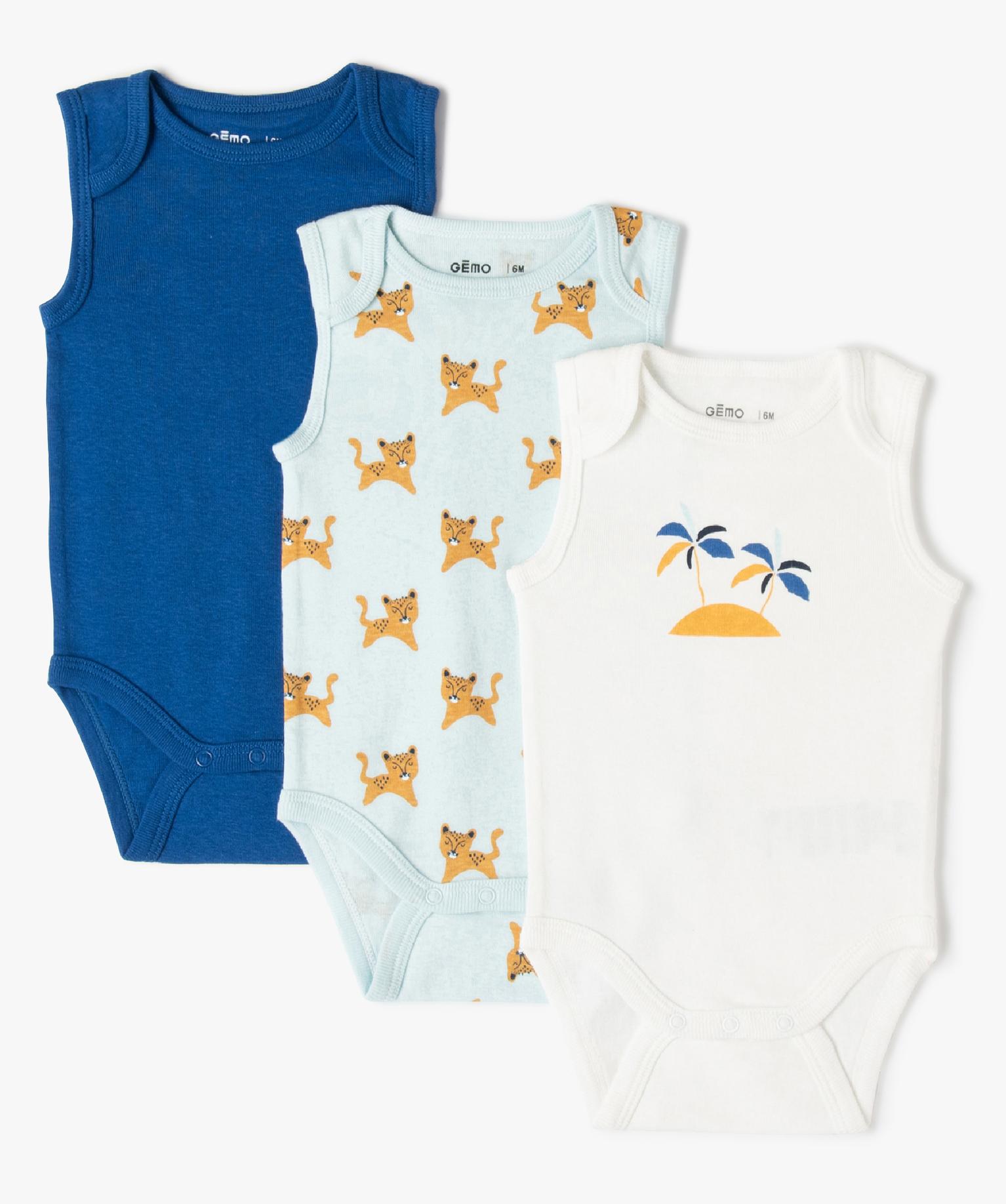 Pratique pour les beaux jours, le body bébé sans manches ! Il est invisible sous les tee-shirts à manches courtes ou sans manches... et surtout il peut être porté comme un débardeur ! Craquez ici pour le lot de 3 bodies bébé ornés de petits motifs ! Composés de coton biologique, ces bodies respectent les peaux les plus sensibles. Ils s’enfilent facilement grâce à une encolure américaine qui s’ouvre largement. L'entrejambe pressionné facilite le change.