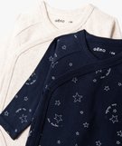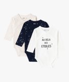 Facile à enfiler grâce à sa coupe cache-cœur et ses boutons-pression, le body croisé est idéal dès la naissance. Vendu en lot de 3, ces bodies bébé feront un superbe cadeau de naissance ou une base solide pour le vestiaire de votre tout-petit. Les manches longues sont parfaites en toutes saisons. Les bodies affichent des motifs et coloris différents pour varier à chaque change. Le lot comprend un body chiné uni, un body parsemé d'étoiles et un body avec message placé. Entrejambe pressionné. Emmanchures raglan. Finition bord-côte assortie.