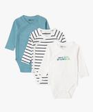 Parce qu’on n’a jamais assez de bodies pour habiller bébé pendant les premiers mois, Gémo présente ce lot de 3 bodies à manches longues. Des sous-vêtements particulièrement doux, confectionnés en coton biologique, et dotés d’une fermeture croisée avec boutons pression, facilitant l'habillage pendant les premiers mois de bébé. Ce lot de bodies bébé garçon à fermeture croisée se compose d’un modèle uni, d’un body rayé façon marinière et d’un modèle avec inscription sur la poitrine. Emmanchures raglan. Entrejambe pressionné.