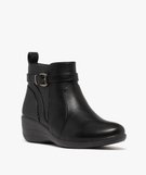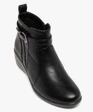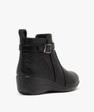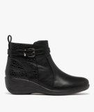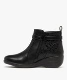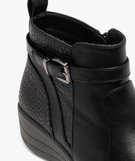 Ces boots femme allient toute l’élégance d’une bottine citadine au confort d’une semelle compensée, pensée pour trottiner sans fatiguer. Ces boots sont réalisés dans un mix de matière lisse cuir imitation et d’empiècements texturés façon reptile. La tige est agrémentée d’une bride fermée par une boucle en métal. Ces bottines confort s’enfilent facilement grâce à une tirette au talon et un zip intérieur. Elles accompagnent les jupes comme les pantalon avec raffinement.