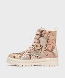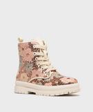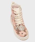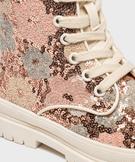 Faites scintiller les journées de votre fille avec ces boots crantées au style unique ! Entièrement recouvertes de sequins brillants formant un délicat motif de fleurs, ces bottines fille apporteront une touche de girly et de caractère à toutes ses tenues. Les lacets plats et la languette unie créent un contraste élégant. La tige haute ajustable par lacets assure un bon maintien de la cheville. Mais les chaussures restent très pratiques au quotidien grâce à son discret zip sur le côté intérieur du pied. Un véritable bijou de chaussure pour les petites filles qui aiment briller mais avec du caractère ! Tirette sur le contrefort. Doublure moelleuse. Semelle intérieure moussée.