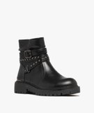 Boots femme à semelle crantée avec brides fantaisie et col effet drapé noir