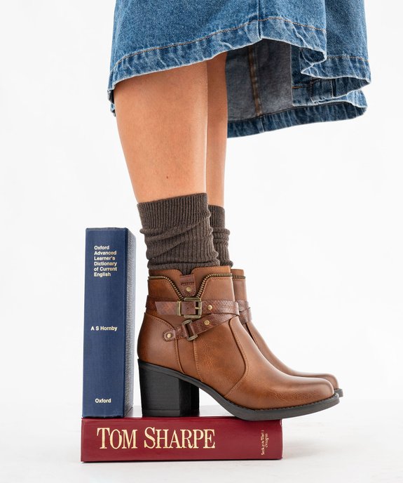 Boots femme à talon carré avec zip intérieur et col fantaisie marron