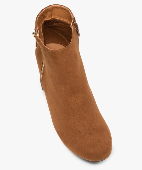 Boots femme à talon carré en suédine unie et zip décoratif marron