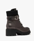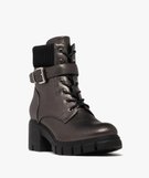 Laissez-vous envoûter par le caractère audacieux de ces boots femme ! Des boots à talon, largement inspirées des rangers, pour celles qui aiment les looks rebelles ou rock ! Ces bottines à lacets sont confectionnées dans une matière synthétique cuir imitation lisse, soulignée en haut de tige par un col en bord-côte qui leur donne un côté comfy et chaleureux. Elles sont dotées d'une tige haute ajustable par des lacets et d'une bride à large boucle autour de la cheville. Elles sont montées sur une semelle crantée épaisse avec un talon bien stable. Les bottines s'enfilent aisément grâce à un zip sur le côté intérieur du pied. La doublure textile, légèrement rembourrée, est chaude et confortable.