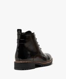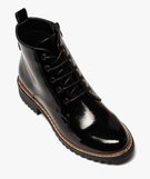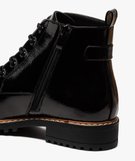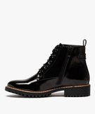 Voilà un modèle de boots original ! La tige, entièrement confectionnée en matière vernie, adopte une forme classique avec laçage jusqu’au col. Ces boots pour femme sont montés sur une semelle crantée. La touche qui fait la différence, c’est la couture débordante et le pourtour de la semelle qui contrastent avec le reste de la chaussure ! Ces boots originaux compléteront autant les tenues chics que les tenues les plus décontractées, toujours avec beaucoup de style. Ajustement lacets ronds cirés ton sur ton 5 œillets métalliques. Fermeture zippée sur le côté interne du pied.