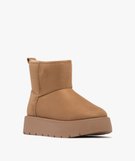 Devenues incontournables pour l'hiver, ces bottines fourrées maintiennent vos pieds au chaud. La doublure et la semelle intérieure en fourrure imitation sont d'une douceur incroyable. Une sensation cocooning réconfortante alliée au style tendance de l'épaisse semelle compensée. Ces boots plateforme se portent avec une tenue casual et selon vos envies : jean slim, robe sur collants ou pull-robe sur legging.... Insertion facile du pied et semelle intérieure moussée.
