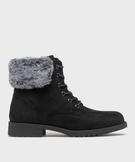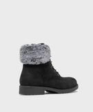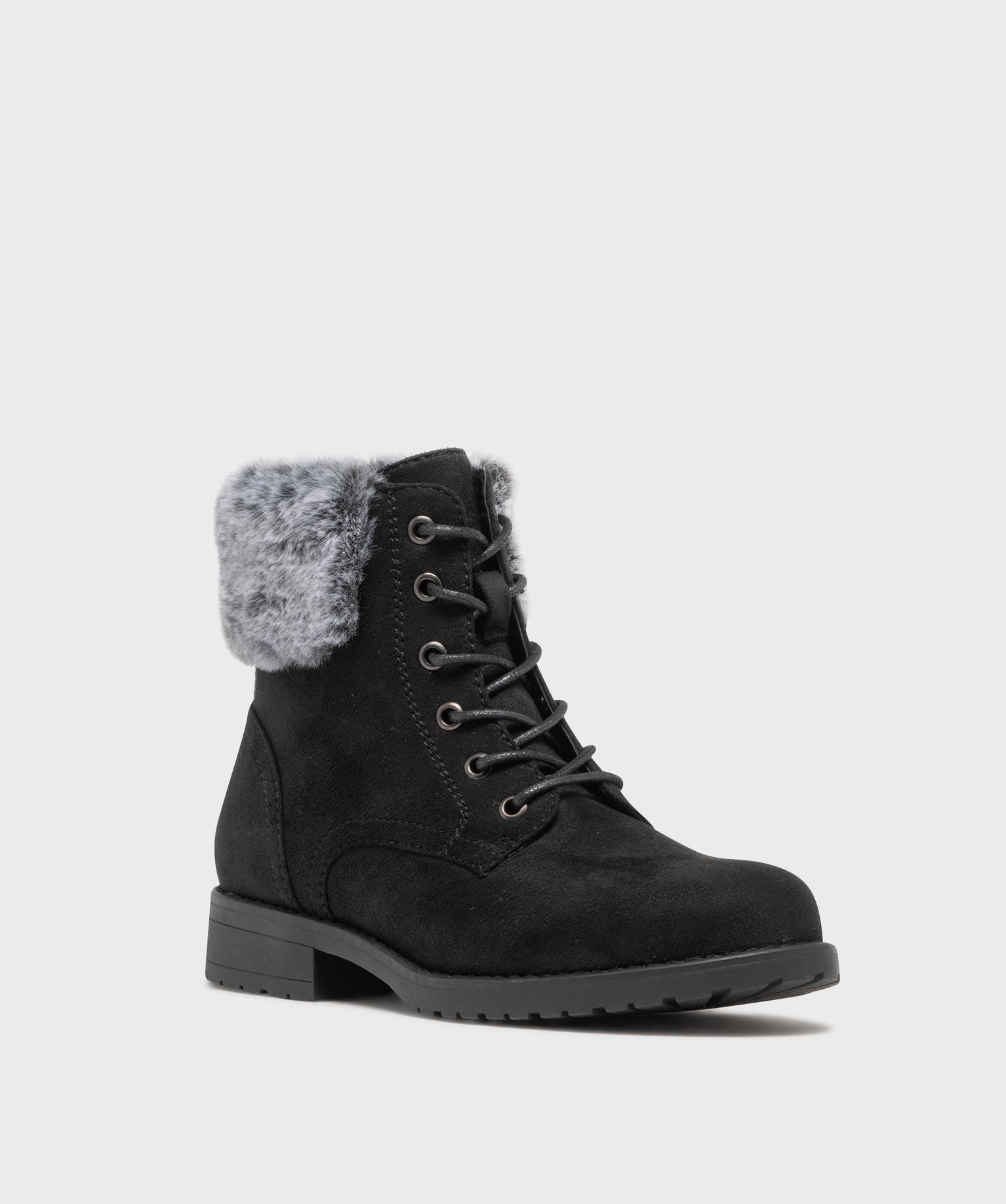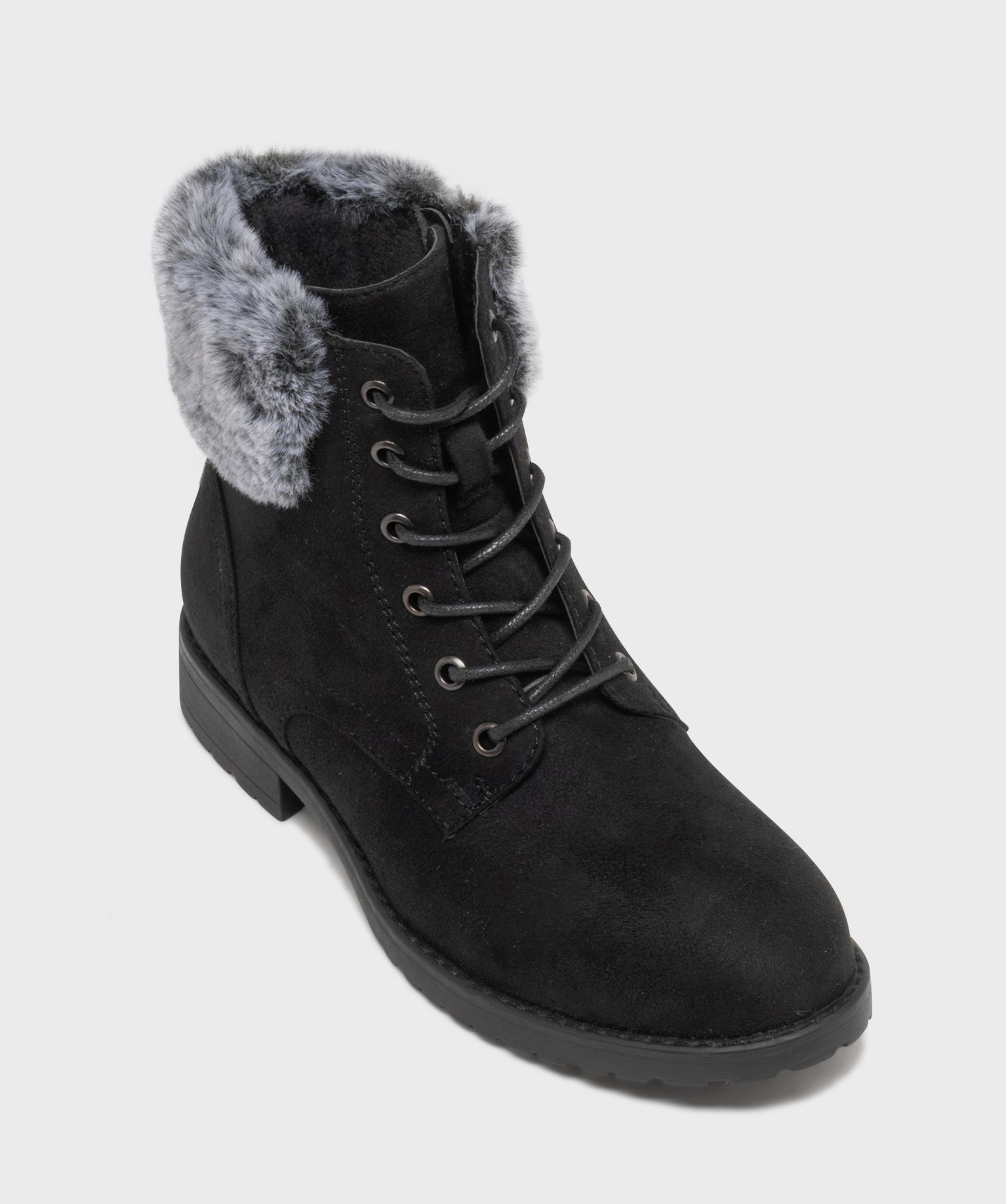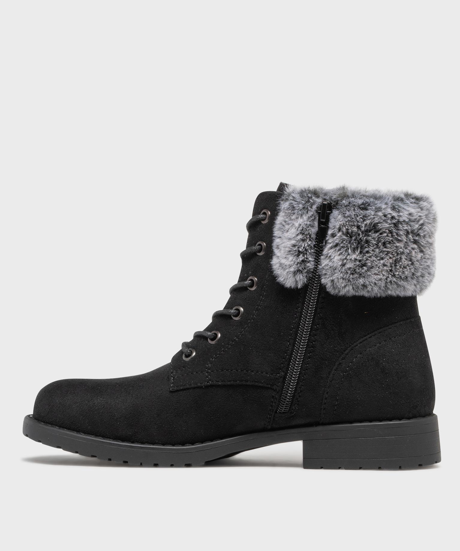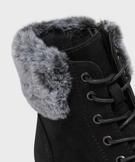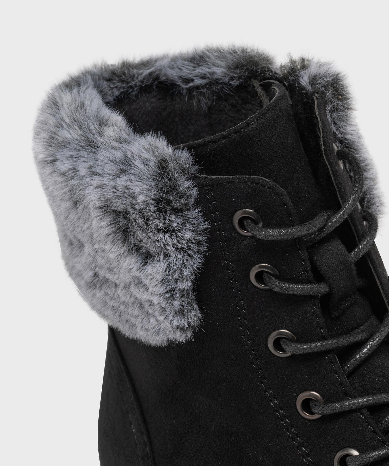 Boots fourrées à lacets, semelle crantée et col fantaisie femme noir