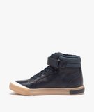 Un joli look de baskets mid pour ces boots fourrées pour garçon. La tige finement grainée est mise en relief par des bandes contrastées sur les côtés, un col matelassé mat et une semelle bicolore dont l'avant remonte sur le bout de la chaussure. Pour garder les pieds de votre enfant au chaud tout l’hiver, ces boots sont entièrement doublées d’un textile peluche très doux au toucher. À porter avec un jean et un sweat douillet pour une allure casual au quotidien. Fermeture facile par lacets élastiques 5 œillets + 1 bande scratch.