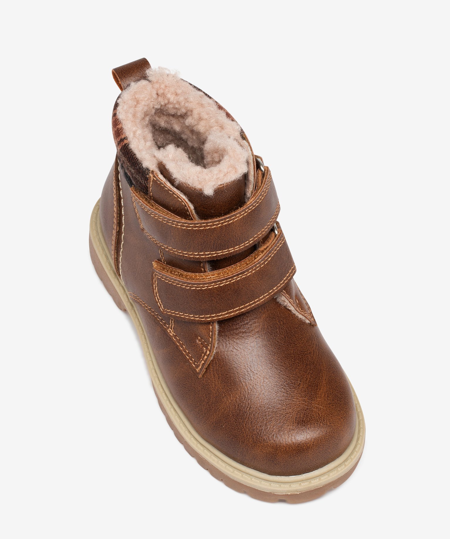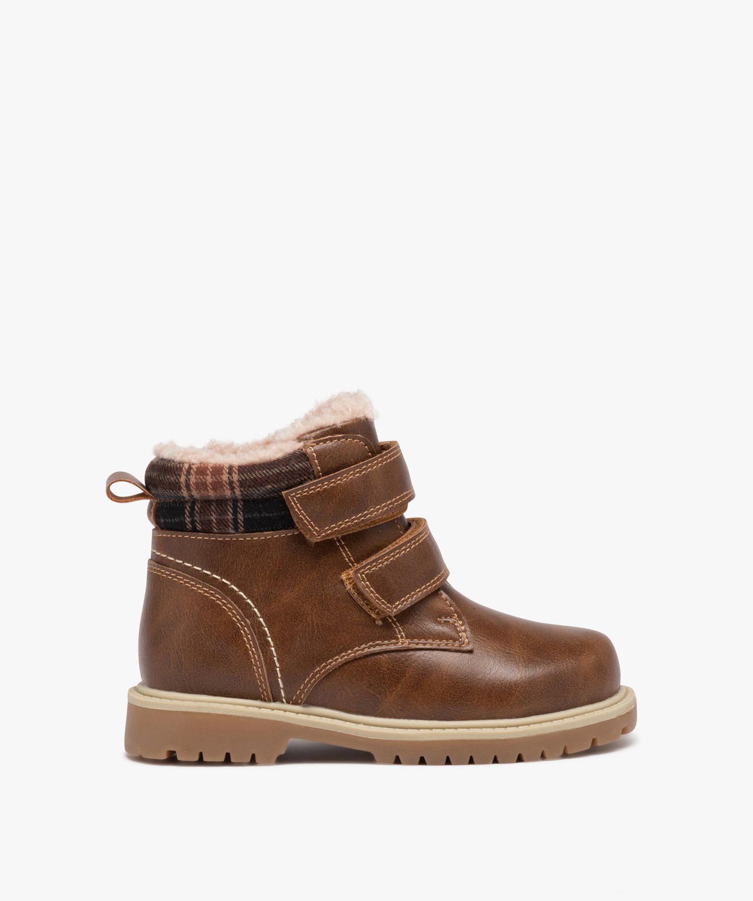 Ces jolies boots fourrées pour garçon affirment avec style leur look worker. La tige unie, en matière synthétique imitation cuir grainé est mise en valeur par des surpiqûres doubles et contrastantes, mais surtout par un élégant col rembourré et matelassé, confectionné en tissu à carreaux. Au top pour une allure casual chic. Entièrement doublées de fourrure imitation et montées sur une semelle crantée, ces boots chaudes seront parfaites pour compléter les tenues hivernales : pantalon en velours ou en toile épaisse, cargo, pull en grosse maille ou pull jacquard à col châle. Pratiques, les chaussures montantes se ferment par 2 bandes scratch et possèdent une tirette sur le contrefort.