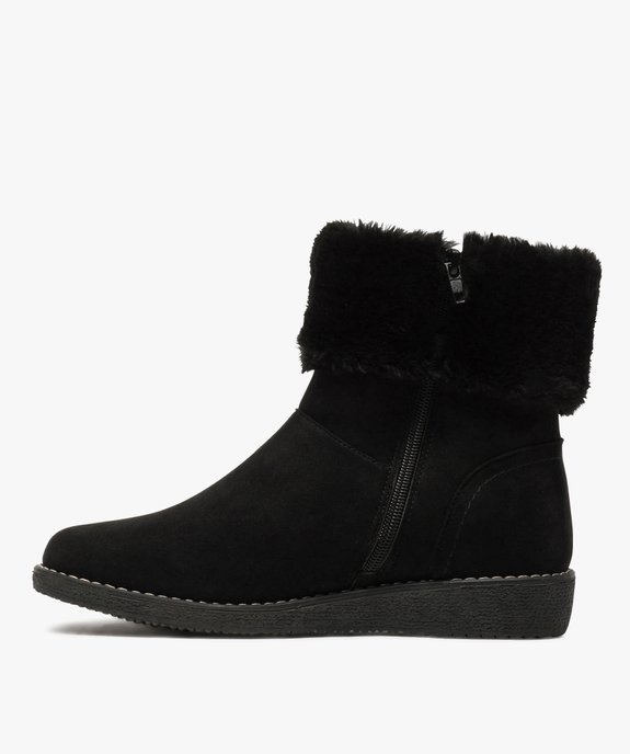 Craquez pour le style et le confort de ces boots fourrées pour femme. Des boots en suédine unie avec intérieur réconfortant en textile façon peluche pour envelopper les pieds de douceur. Cette jolie doublure habille généreusement le col. On retrouve une patte avec boucle décorative sur le haut de la tige. Ces boots chaudes sont montées sur une semelle amortissante avec couture débordante charmante. Vous porterez ces bottines avec un jean slim et une doudoune pour affronter l’hiver les pieds au chaud ! Fermeture zippée sur le côté du pied.