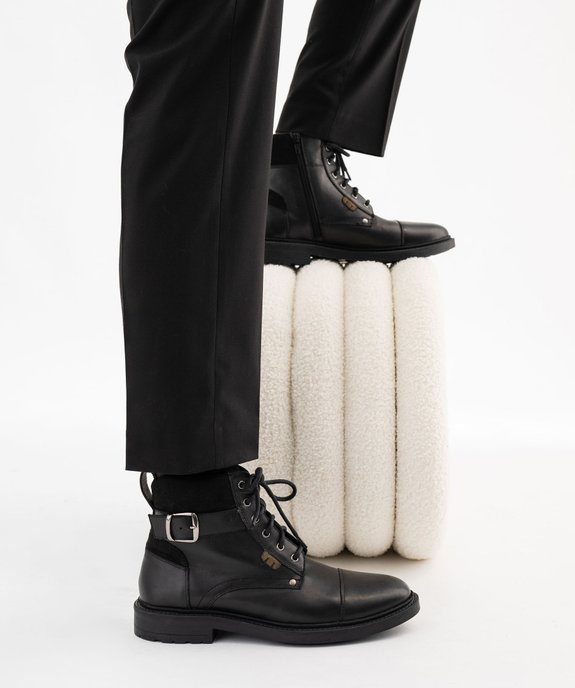 Ces chaussures homme mélangent les styles pour une version moderne des boots façon derbies. Dessus en cuir, bout droit arrondi et une tige montante avec col et languette moussés, elle sont décorées d'une bride fantaisie à boucle et s'équipent de lacets ronds à oeillets métallisés. Elles sont à mi-chemin entre la combat boots tendance et la Balmoral, très classique. Pour les porter, osez les styles décalés. Semelle intérieure moussée et en cuir.