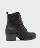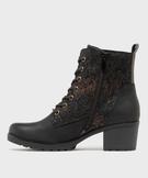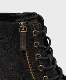 Ces bottines femme arborent une silhouette classique à bout rond, modernisé par une semelle crantée et un zip intérieur pour faciliter l'enfilage. Spécialement conçues pour la saison automne-hiver, les boots sont dotées d'une doublure intérieure chaude. Elles sont magnifiées par un imprimé d'inspiration baroque aux reflets subtilement colorés et un empiècement texturé peau de serpent imitation. Les boots présentent également un zip décoratif sur le côté extérieur du pied. Fermeture par lacet rond en coton ciré passé dans 7 paires d'œillets en métal vieilli. Tirette sur le contrefort.