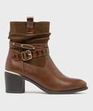 Ces bottines pour femme ajouteront une touche de sophistication aux tenues citadines. Elles se démarquent par leur alliance de cuir imitation sur le dessus et de textile velours effet drapé sur la tige. Autour de la cheville, des brides fantaisie rehaussées de détails métalliques viennent sublimer la silhouette avec une pointe d’originalité. Ces bottines Emilia Rosa reposent sur une semelle débordante et un large talon ultra stable, alliant confort et allure. Fermeture par zip intérieur et tirette en haut de la tige.
