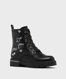 Les filles vont adorer ces bottines Lovely Wings à l’esprit glam’rock. Elles sont agrémentées d’inscriptions, de motifs coeurs et de touches pailletées sur la tige, et reposent sur une épaisse semelle crantée. Ces bottines fille s’ajustent à chaque pied grâce à des lacets plats incrustés de fil métallisé et s’enfilent facilement par zip intérieur. Elles se portent aussi bien avec un jean retroussé qu’avec une robe pull. Tirette au talon. Détail métallique sur l'arrière de la semelle.