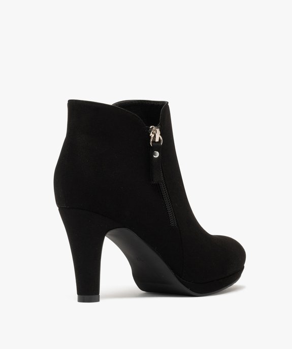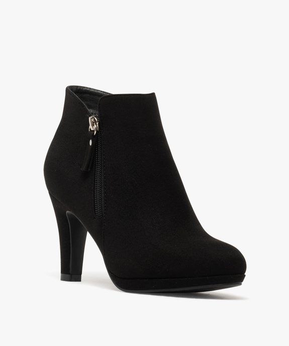 Fin et haut, le talon apporte une réelle élégance à ces bottines pour femme. En suédine, la tige unie s'équipe d'un zip intérieur pratique pour les chausser et d'un zip extérieur fantaisie. De véritables escarpins d'hiver, ces boots à talon se portent avec robes et jupes sur collants, ensembles tailleurs et combinaisons en jeans. Semelle intérieure moussée.