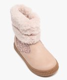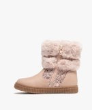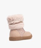 Une bottine pour fille très girly et bien chaude ! Les boots présentent une ligne sobre mise en lumière par de grands empiècements pailletés sur les côtés, un large col en fourrure imitation et une bride tressée. Conçues pour l'hiver et particulièrement confortables, ces bottines possèdent une doublure en fourrure imitation et une semelle intérieure en mousse. Pratiques, elles sont dotées d'une fermeture zippée sur le côté intérieur du pied.