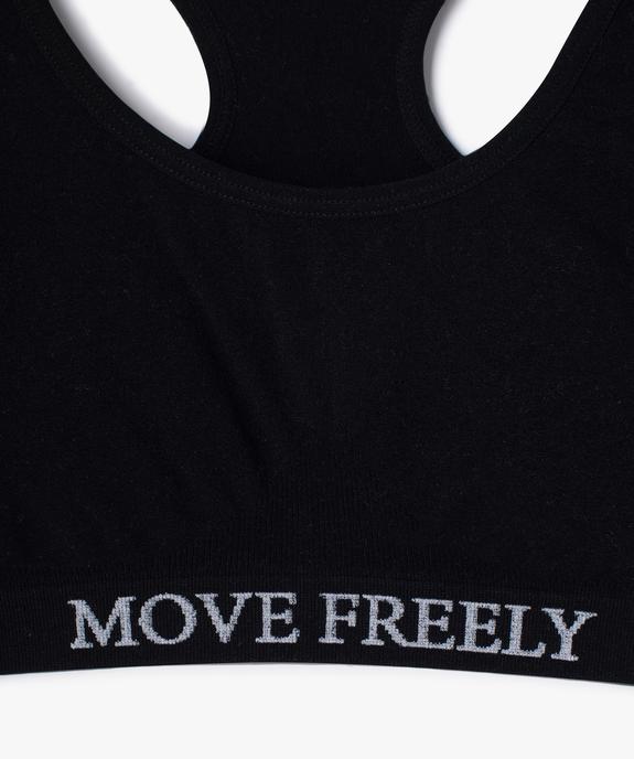 Cette jolie brassière pour fille offre un excellent maintien tant pour les activités sportives que pour être à l’aise au quotidien. Une brassière confectionnée en maille extensible sans coutures pour limiter les irritations, qui tient parfaitement grâce à un tour de buste élastique. Cette brassière dos nageur assure une silhouette parfaite. Avec son inscription dans le bas, elle ajoute une touche mode dans la collection de sous-vêtements des ados.