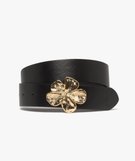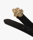 Cette jolie ceinture pour femme permettra d’ajouter une touche élégante et féminine à toutes les tenues. Une ceinture large confectionnée dans une matière lisse imitant le cuir, fermée par une grosse boucle métallique en forme de fleur qui se ferme à l’aide d’un picot à insérer. Elle se porte sur un pantalon en toile comme pour souligner la taille d’une robe fluide.
