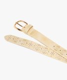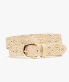 Laissez-vous charmer par le style bohème de cette ceinture pour femme. Elle est fabriquée dans une matière synthétique légèrement irisée, ajourée de motifs fleuris et décorée de petits clous en métal doré. Cette ceinture apportera une touche folk à tous vos pantalons et jupes ! La ceinture se ferme à l'aide d'une boucle légèrement arrondie, en métal doré pour une touche de brillance supplémentaire. Fermeture par boucle ardillon. Trous préformés. Bout de ceinture pointu. Surpiqûres ton sur ton.