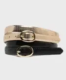 Un duo pensé pour multiplier les styles sans effort ! Les 2 ceintures femme reprennent exactement la même forme avec motif en relief, mais jouent chacune une personnalité différente : l’une est vernie pour une touche élégante et brillante, l’autre dorée pour un style glamour. Leur boucle ovale dorée ajoute une note chic et intemporelle. Assez fines, elles s’adaptent à toutes les envies : parfaites pour structurer un pantalon au quotidien ou pour cintrer une robe du soir et apporter la touche finale qui change tout. Un lot de ceintures polyvalent, féminin et pratique.