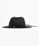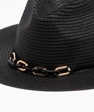 Protégez-vous des rayons du soleil avec élégance et style grâce à ce charmant chapeau de paille ! Un chapeau femme, forme fedora, en paille de papier unie, mise en relief par une garniture fantaisie : de longs liens noués sur l'arrière avec de gros maillons de chaîne bicolores sur l'avant. Un accessoire facile à assortir avec une robe, une combinaison ou un pantalon !