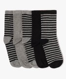 Pratique le lot de 5 paires de chaussettes pour garçon ! Des chaussettes hautes déclinées dans des couleurs sobres et faciles à associer avec l’ensemble du vestiaire. Ces chaussettes contiennent du coton biologique pour offrir un maximum de confort. Ce lot se compose de 3 paires de chaussettes rayées et de 2 paires unies. Bord-côte élastiqué en haut de la tige.