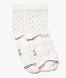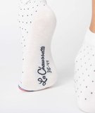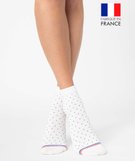 Fabriquées en France selon un savoir-faire traditionnel, les chaussettes femme La Chaussette vous séduiront par la qualité de leur confection et le chic de leur design à pois ! Des chaussettes qu'on a envie de montrer tout le temps ! Talon et pointes renforcés. Bande tricolore à la pointe et petit drapeau français en haut de tige.