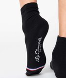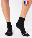 La marque française La Chaussette signe ici une très élégante paire de chaussettes femme, tricotée dans un fil de coton majoritaire de qualité, qui vous procurera un confort optimal dans toutes vos chaussures. Talon et pointes renforcés. Bande tricolore à la pointe et petit drapeau français en haut de tige.
