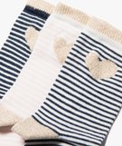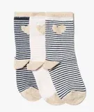 Lot de 3 paires de chaussettes pour fille à tige haute, idéales dans les bottines comme dans les baskets. Ces chaussettes séduiront les petites modeuses par leur brillance et leur originalité. Chaque chaussette rayée est soulignée d'un bord-côte, d'un talon, d'une pointe et d'un motif cœur en fil doré ravissants. En coton stretch, ces chaussettes sont douces et confortables.