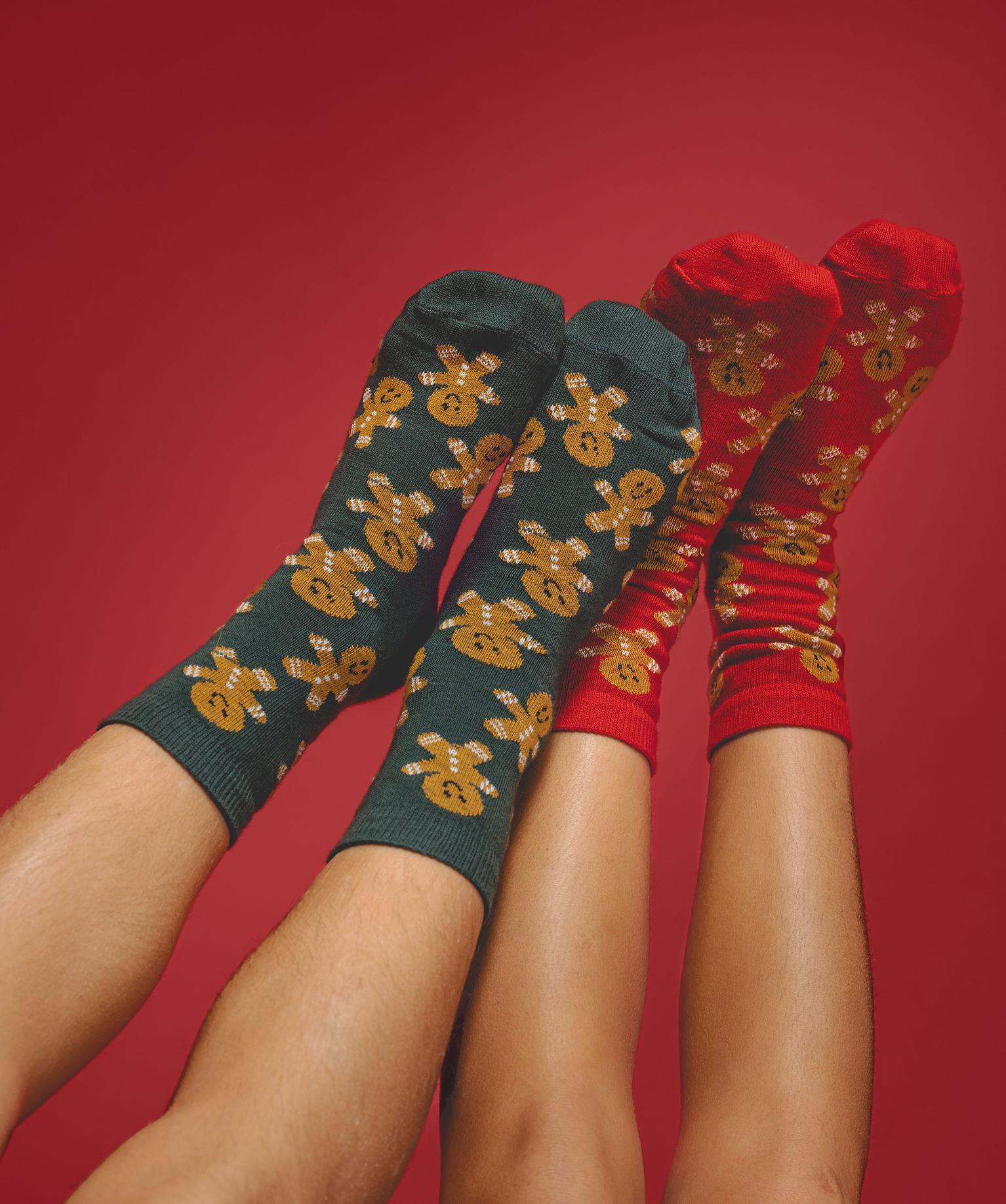 Ces adorables chaussettes garçon ornées de petits bonhommes en pain d’épices apportent une touche gourmande et joyeuse au dressing des enfants. Un lot de deux paires parfait pour les fêtes : l’une entièrement décorée de bonhommes malicieux, l’autre animée d’un motif discret placé en haut de la tige. Confortables et pleines de fantaisie, ces chaussettes de Noël ajoutent une note humoristique et festive aux tenues de fin d’année.