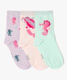 Indispensable de la garde-robe, les chaussettes en coton fin sont proposées ici en lot de 3 paires pour avoir le choix du style et pour faire de belles économies. Les chaussettes fille sont décorées de motifs sirène ou hippocampe selon les paires, avec un haut de tige en bord-côte pailleté. À révéler en les portant avec un jean retroussé par exemple !
