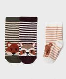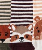 Lot de 3 paires de chaussettes hautes pour bébé. Le lot comprend 3 paires de chaussettes bébé rayées avec une petite tête d'animal sur le dessus du pied : ours, renard et raton laveur. Les chaussettes sont confectionnées en coton biologique avec une pointe d'élasthanne pour la douceur et le confort de votre enfant. Talon et bout renforcés. Haut de tige en bord-côte élastiqué.