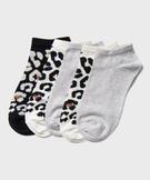 Ajoutez une irrésistible touche tendance à votre look grâce à ce lot de 5 paires de chaussettes femme. Des chaussettes ultra-courtes particulièrement pratiques dans les baskets pour un maximum de confort et un effet pieds-nus. Ce lot se compose de trois paire de chaussettes à motif léopard et de deux paires unies. Haut de la tige élastiqué.