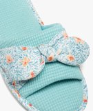 Ces chaussons pour femme s’inscrivent dès le premier coup d’œil parmi les pièces fraîches et colorées, idéales pour l’été ! Ce sont des mules plates dont la première de propreté et le bandeau sont recouverts d'un tissu nid d’abeille uni. On retrouve une lanière en jersey fleuri nouée sur le bandeau et en finition sur le pourtour du chausson. Le top ? Ces jolies pantoufles sont accompagnées d’un sac en tissu assorti pour les emmener partout avec vous. Des chaussons à offrir ou à s’offrir sans modération !