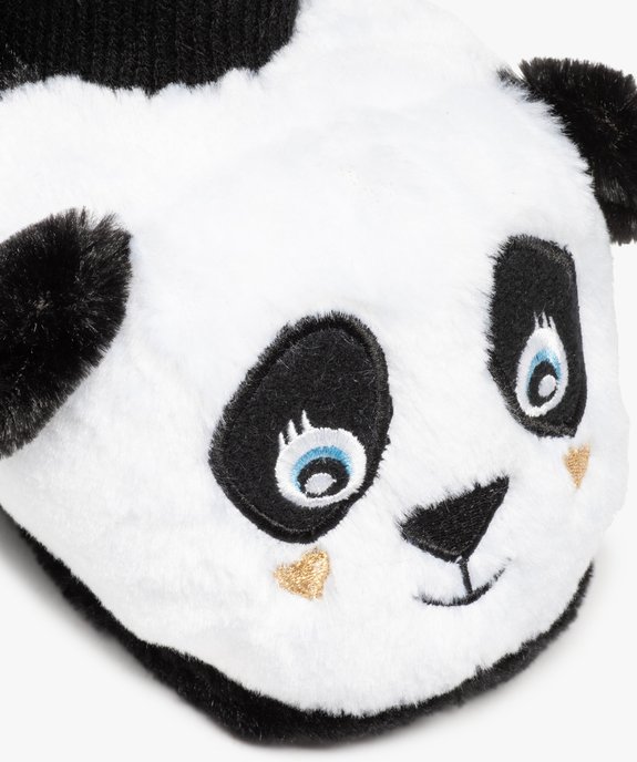 Toujours aussi fascinants, les chaussons peluche se déclinent ici en pandas ! Des chaussons en volume pour fille, travaillés comme des peluches, qui reproduisent une adorable tête de panda sur l’avant du pied – avec oreilles en relief – sans oublier sa petite queue toute ronde fixée sur le contrefort. Deux petits cœurs brodés au fil métallisé apportent une touche girly à ces pantoufles. On aime le col montant en maille côtelée, comme une chaussette, qui permet de bien les faire tenir au pied.