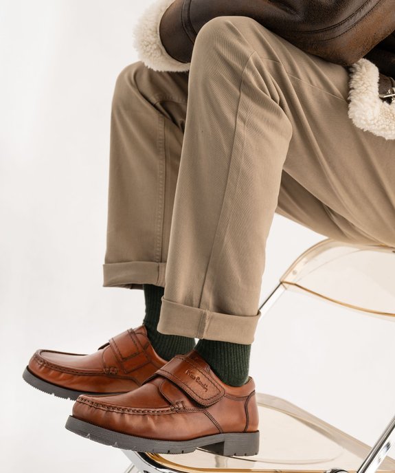 Retrouvez ici tout le confort d’une chaussure bateau avec l’élégance d’un derby. Ces chaussures bateau confort pour homme présentent une tige en cuir lisse uni. L’avant du pied est cousu sur l’extérieur : une finition qui apporte de la souplesse au chaussant. Ces chaussures bateau unies sont montées sur une épaisse semelle amortissante et antidérapante. Col et languette rembourrés. Des chaussures confort à associer à un pantalon en toile ou en velours côtelé. Fermeture large bride scratch sur le dessus.