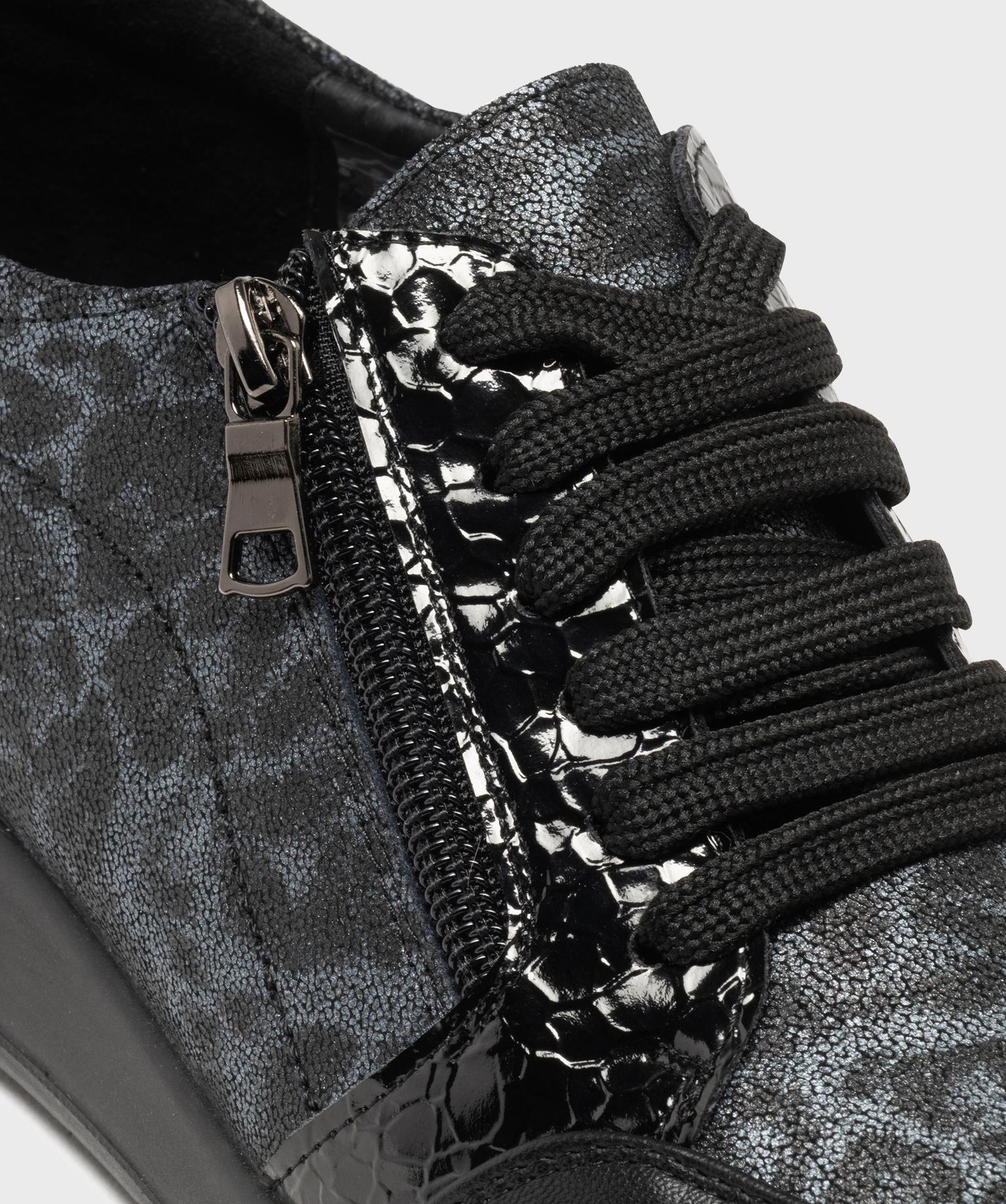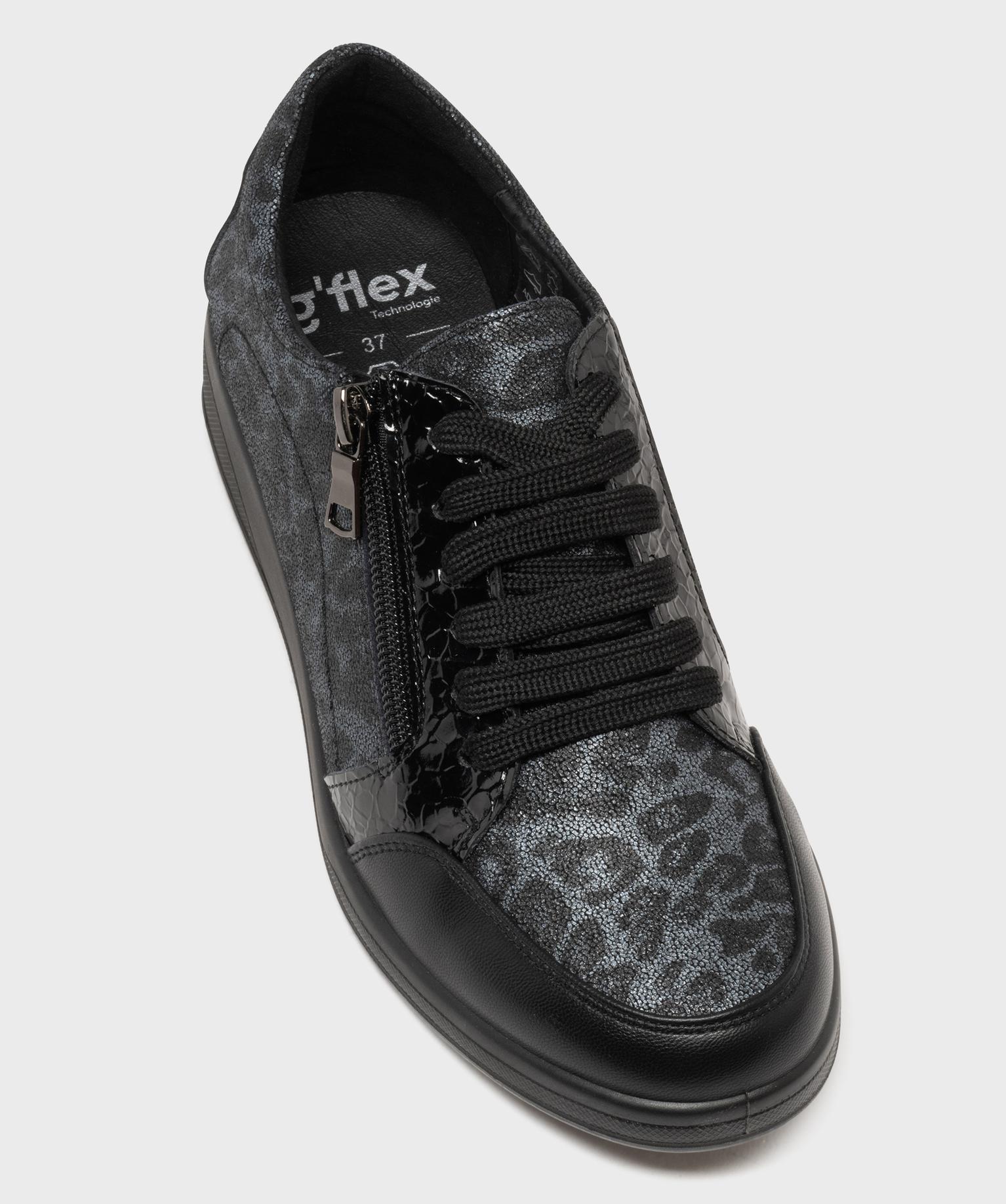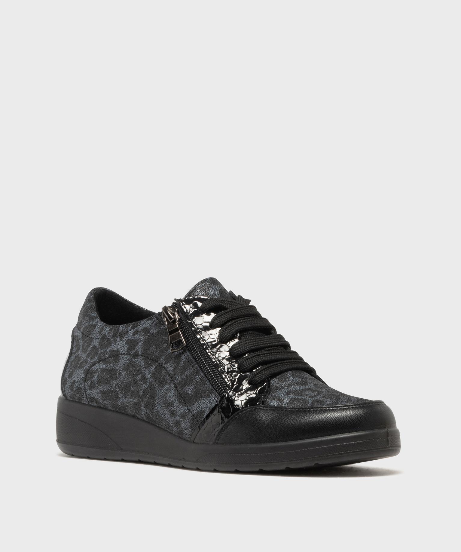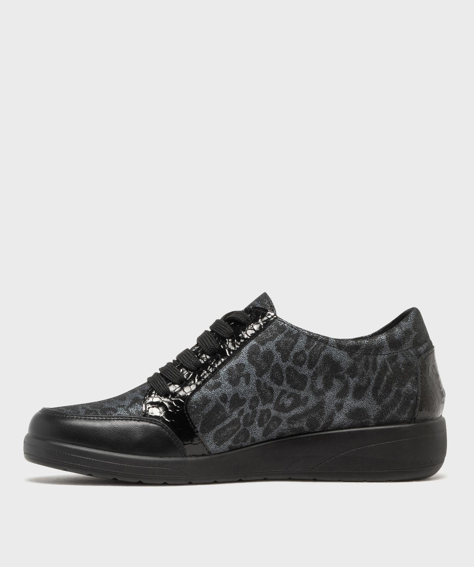 Gémo revisite les chaussures confort avec style à travers ce modèle en cuir à motif léopard subtilement irisé. Elles sont agrémentées d’un empiècement en cuir lisse et de touches vernies façon croco. Ces chaussures confort femme possèdent une double fermeture par lacets plats permettant un ajustement parfait et par zip pour un enfilage rapide. Elles reposent sur une semelle à talon compensé offrant un excellent amorti.