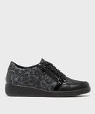 Gémo revisite les chaussures confort avec style à travers ce modèle en cuir à motif léopard subtilement irisé. Elles sont agrémentées d’un empiècement en cuir lisse et de touches vernies façon croco. Ces chaussures confort femme possèdent une double fermeture par lacets plats permettant un ajustement parfait et par zip pour un enfilage rapide. Elles reposent sur une semelle à talon compensé offrant un excellent amorti.
