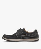 Ces chaussures pour homme imaginée par Pierre Cardin s’inspirent à la fois des chaussures bateau et de l’univers sportswear. Leur dessus en cuir nubuck est rehaussé de surpiqûres contrastantes et d’un lacet bicolore sur les côtés. Elles se ferment à l’aide d’une large bride à scratch sur le dessus et reposent sur une semelle bicolore renforcée par une piqûre latérale. Des chaussures bateau doublées cuir avec semelle intérieure cuir rembourrée et amovible. Elles accompagneront les jeans comme les pantalon en toile.