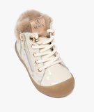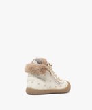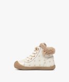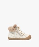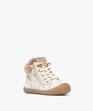 Chaussures premiers pas bébé fille boots en cuir à col duveteux et semelle pailletée - Alma Planète beige