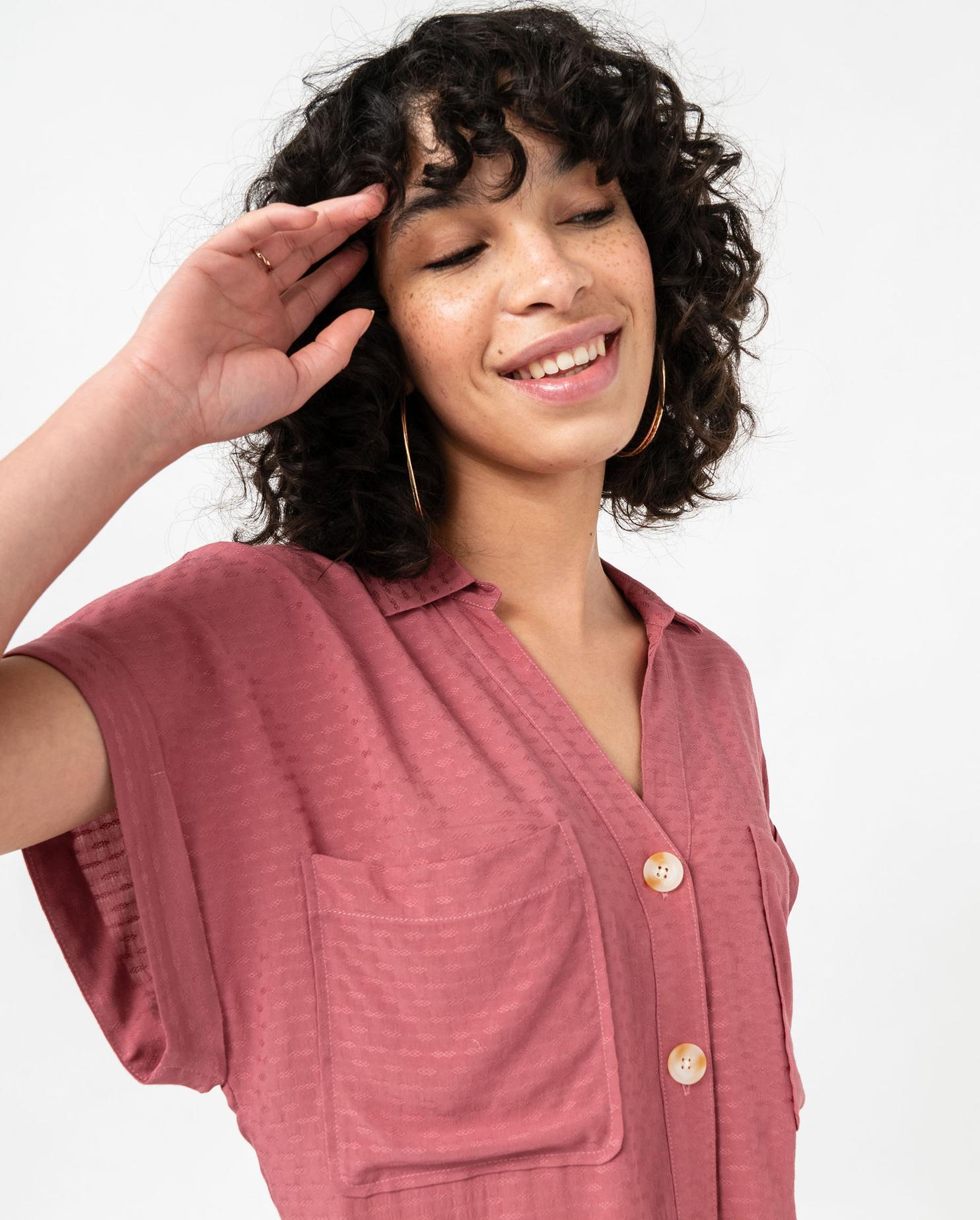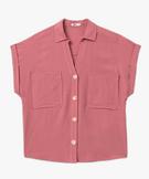 Ses manches courtes, ornées de revers cousus, lui confèrent une allure décontractée, accentuée par des épaules tombantes et deux larges poches plaquées sur la poitrine. Le col classique avec une ouverture en V ajoute une note de féminité à ce chemisier. Il se porte avec tous les bas de votre garde-robe qu’il s’agisse d’une jupe ou d’un pantalon.