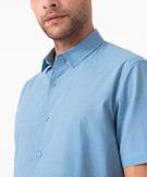 Jolie chemise pour homme en voile de coton délicatement texturé. Une chemise à manches courtes et coupe droite, plutôt ample, pour un porté confortable même en plein été. La chemise unie possède un col classique souple, une fermeture par boutons ton sur ton et une base arrondie, impeccable par-dessus le pantalon comme glissée dans la ceinture. La chemise regular s'associe aussi bien à un bermuda imprimé qu'à un pantalon chino.